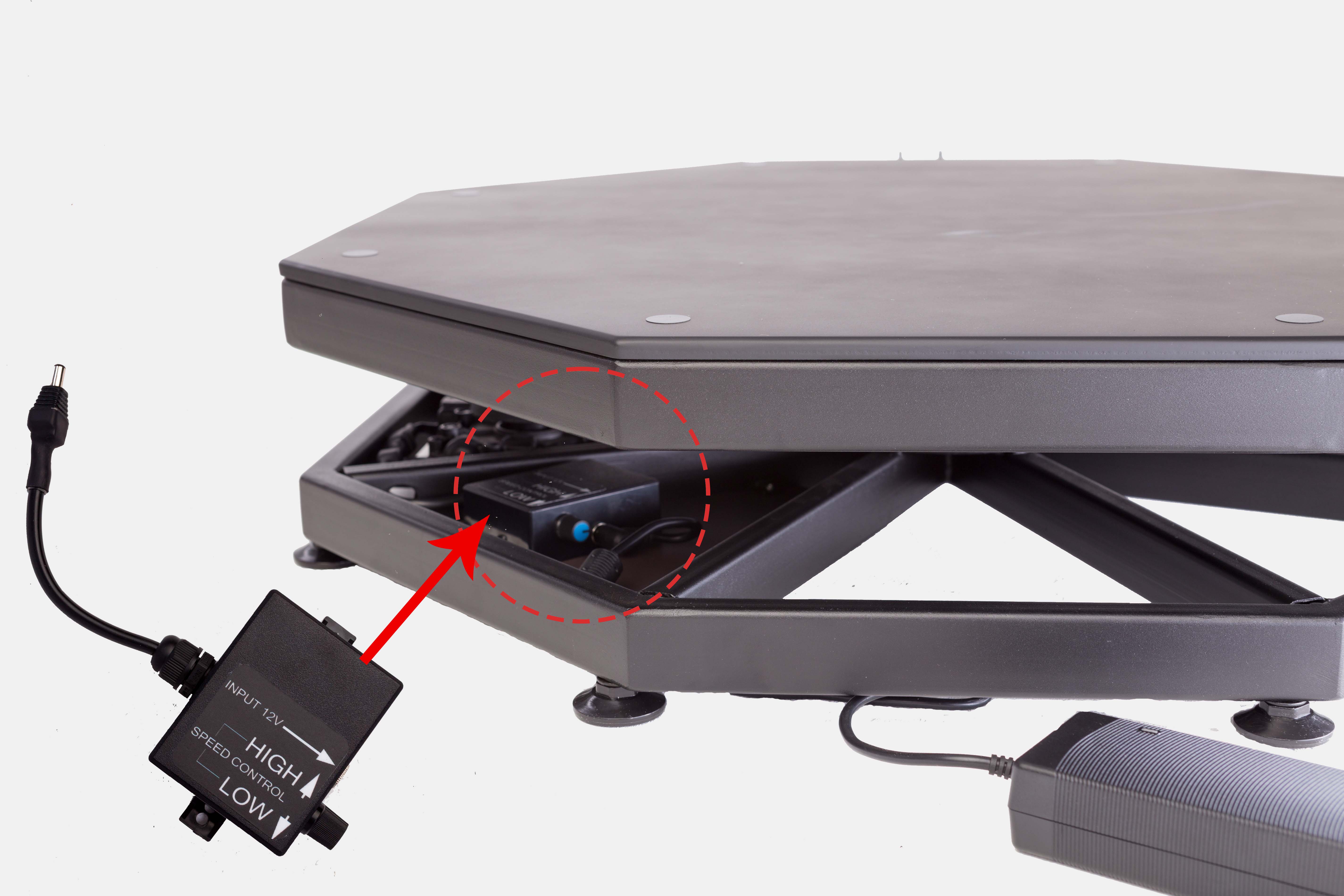 4.Connect the power plug (12V battery can be used) to the platform control unit.